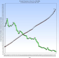 The red line is the number of private firearms in the United States, in units of 100,000. At the end of 2013, the estimate was 363.3 million. The green line is the number of fatal firearm accidents, or unintentional firearm fatalities, in the United States. The number in 2013 was the lowest recorded, 505. The absolute numbers are important, but the rate of unintended firearm fatalities per 100,000 population is a better measure of safety........ -->
