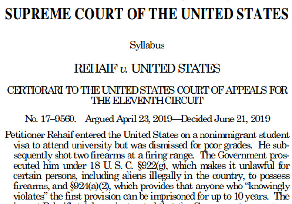 In 1938, Congress, for the first time, created categories of people who could not legally possess firearms under federal law. In 1968, those categories were expanded. In 1986, under pressure from gun owners and the National Rifle Association, the law was reformed, so a person had to know they were in violation in order to be prosecuted. On 23 June 2019, the Supreme Court upheld the reform in the 1986 law.