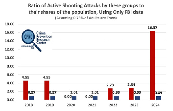 The Crime Prevention Research Center (CPRC), created by John Lott, has published research on the ratio of active shooting attacks by people who are mentally confused about their gender identity, commonly referred to as "transgender". In 2024, according to the CRPC research, "trans" were 12 times as likely to commit an active shooting attack compared to the population as a whole.