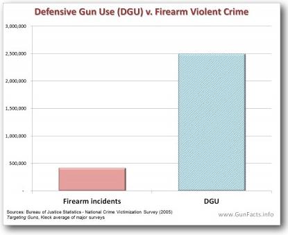5. Crime statistics: Bureau of Justice Statistics - National Crime Victimization Survey (2005). DGU statistics: Targeting Guns, Kleck (average of 15 major surveys where DGUs were reported) Back