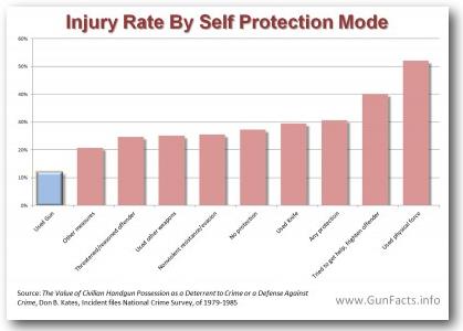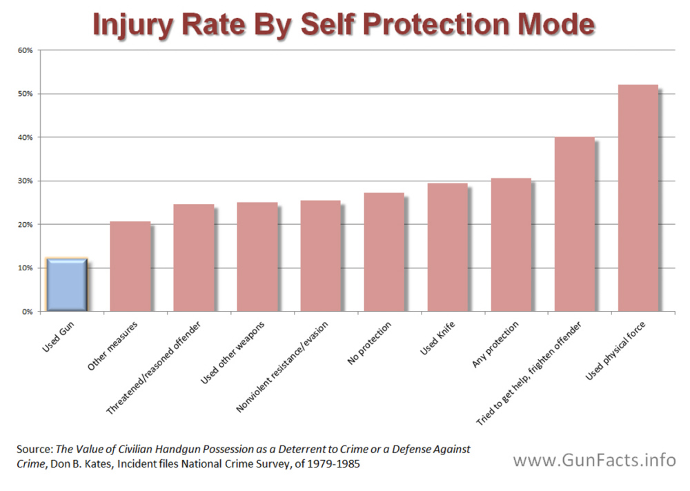 Fact:The probability of serious injury from an attack is 2.5 times greater for women offering no resistance than for women resisting with guns. Men also benefit from using guns, but the benefits are smaller: Men are 1.4 times more likely to receive a serious injury. [19]