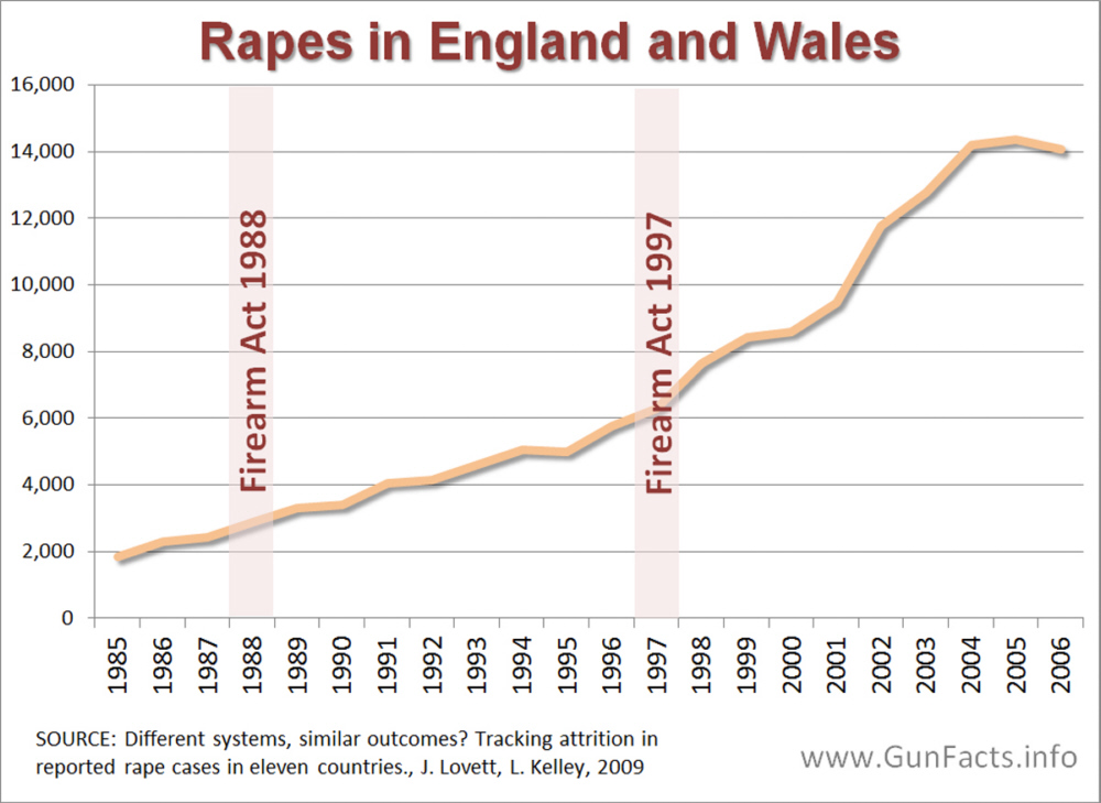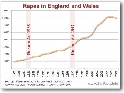 Fact: Firearm availability appears to be particularly useful in avoiding rape. The United Kingdom virtually banned handgun ownership. During the same period handgun ownership in the United States steadily rose. Yet the rate of rape decreased in the United States and skyrocketed in the other countries, as shown in the table.