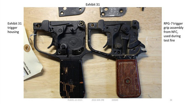 "To demonstrate the functionality of Exhibit 30, I elected to test fire the Exhibit. I utilized a trigger assembly, firing pin, and firing pin spring from an RPG-7 from the NFC and installed these components in Exhibit 30," he wrote.
