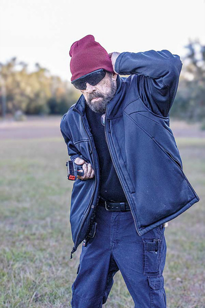 Craig Douglas recommends fingers of the firing hand tight against the lower rib cage, with the gun hand thumb flagged (held vertically) as a felt index against your chest. This helps lock the frame in place and also rotates the slide outward. The latter is important to keep the slide from binding against clothing, which can also cause a malfunction. Some instructors prefer to rotate the gun 45 or even 90 degrees over on its side. This is particularly critical for southpaw shooting: Most autos eject to the right, and you don't want a fold of coat fabric to block the ejection port or bounce a spent casing back into the port as the pistol is cycling.