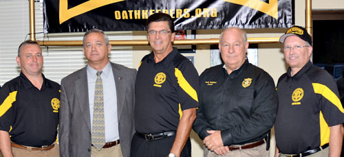 Photo courtesy CLJ News: FROM LEFT: Sussex County, Delaware Sheriff Jeff Christopher; Nick Finch, former Sheriff Richard Mack of Arizona, Bay County Sheriff Frank McKeithen and Brad Rodgers, of Elkhart County Indiana are shown at Saturday's fundraiser. (This was August 30, 2013, coverage of the CSPOA / Oath Keepers fund-raiser organized by Sheriff Mack. See link below.)